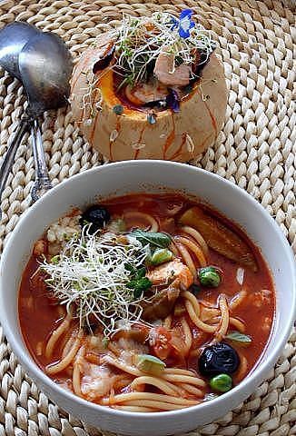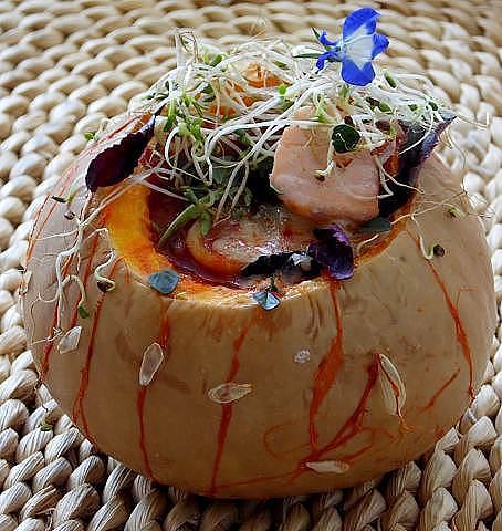 Если хотите подать в тыкве, то заполните тыкву супом и сверху положите кусочек рыбы, посыпьте сыром промазан и добавьте вяленые оливки, тоже самое проделайте с супом при подаче в тарелке.