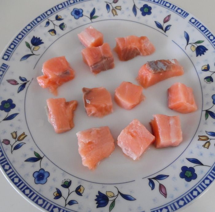 Половину филе нарезать на кусочки и обжарить 5 минут в оливковом масле. Отложить в сторону.