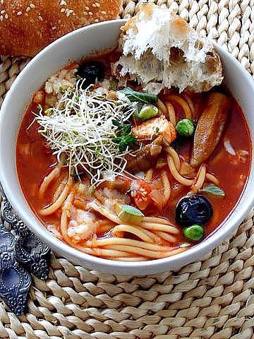 Минестроне с рыбой, спагетти и бамией. Минестроне - это блюдо истинно итальянской кухни, лёгкий суп из овощей. "Большой суп", суп со множеством ингредиентов и из сезонных овощей, иногда с добавлением пасты или риса. Как правило, традиционный рецепт предусматривает, что овощи режутся, варятся до готовности, а затем половина их измельчается в блендере до состояния пюре, которое затем добавляется обратно в суп. У итальянцев существуют также несколько секретов приготовления минестроне: Бульон — важнейший компонент в минестроне. В итальянской кухне обычно используют овощной бульон, реже мясной. Обжарка овощей — только медленная и постепенная на небольшом огне в оливковом масле. Итальянцы обжаривают лук, сельдерей, чеснок, бамия и фенхель. Также используют цуккини и тыкву. Только такая неспешная технология приготовления овощей позволяет приготовить насыщенный ароматный минестроне. Минестроне с рыбой - интересная вариация на тему итальянского томатного супа с макаронами и кусочками филе. Готовится очень просто и быстро! Этот суп готовила в первые, получился очень вкусный,ароматный, муж в восторге.