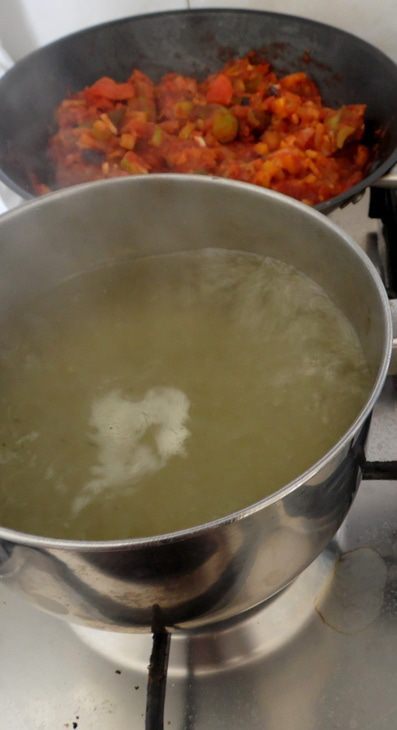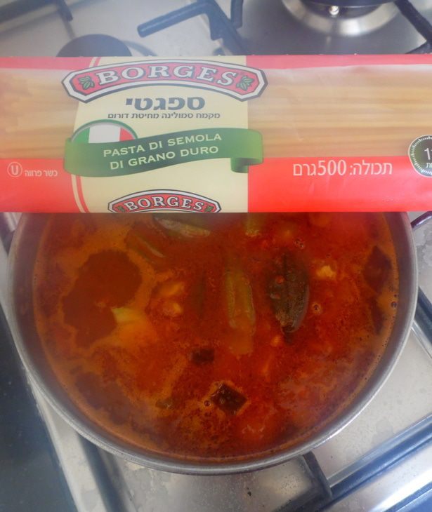 Затем добавить половину филе рыбы и спаггети. Варить суп до готовности пасты.