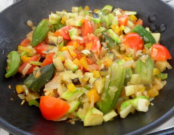 Нарезать овощи. В сковороде на среднем огне разогреть оливковое масло и обжарить в нем лук, чеснок и сельдерей в течение 3 минут, добавить бамию и кабачок, затем баклажан. Добавить томатную пасту, приправы, а затем помидоры, паприку.