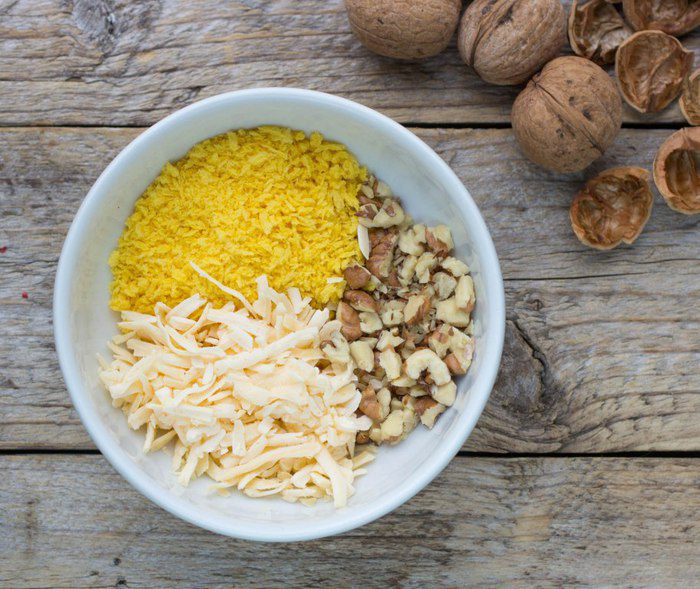 Перемешать сыр, орехи и сухую хлебную крошку (сухари), добавить молотый мускатный орех.