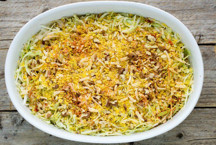Залить капусту молоком, сверху посыпать хрустящей смесью и отправить в предварительно разогретую до 180 градусов духовку на 15 минут. Если готовить из немолодой капусты, время увеличить до 30 минут.