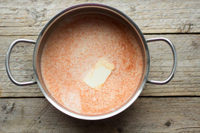 Смешать молоко, сливочное масло, соль, сахар (по желанию), паприку. Довести до кипения. Молоко и сливочное масло можно заменить на сливки.