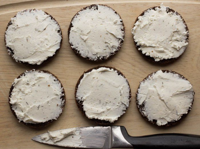Каждый кусочек покрыть слоем творожного сыра.