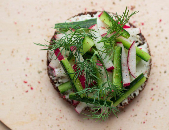 С салатом из редиса, огурца и укропа.