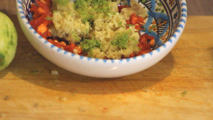 Нарезаем мелко чили перец, снимаем цедру с лаймов и натераем имбирь на мелкой терке.