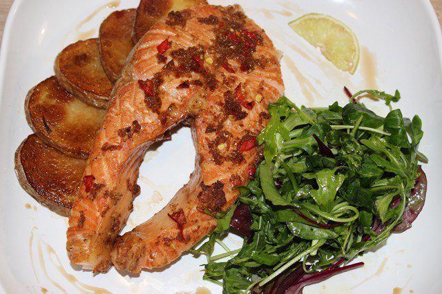 Семга в тайском стиле готова! Подаем с картофелем и микс-салатом.