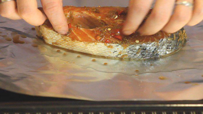 Кладем порционные куски семги (филе или стейки) в маринад на 1,5 часа.