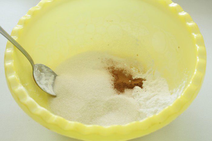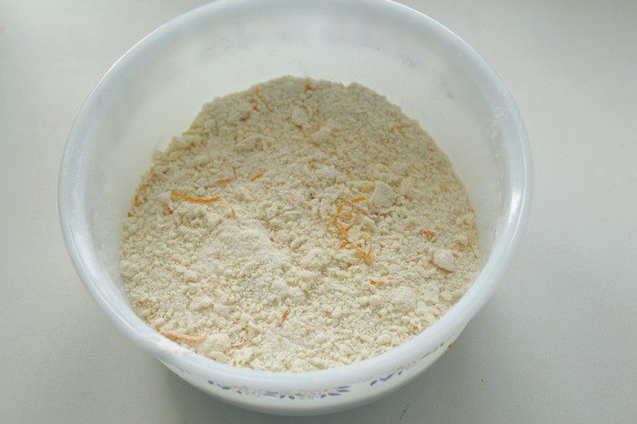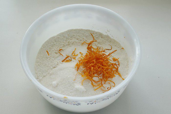 Просейте муку, добавьте сахар, разрыхлитель, соль, и цедру одного апельсина.