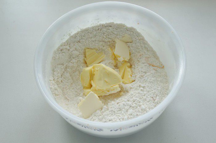 Перетрите масло и муку до состояния крошки, добавьте молоко с сахаром и соком апельсина, перемешайте.