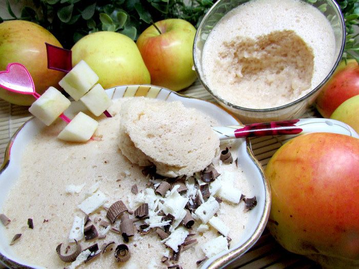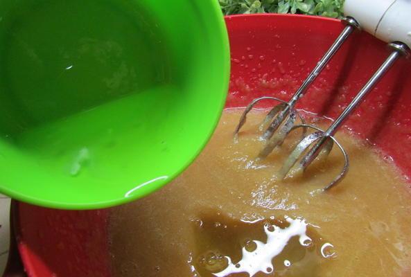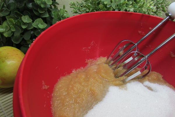 Затем добавляем в яблочное пюре белки и взбиваем до тех пор, пока наша смесь не увеличится в объеме в 2-3 раза.