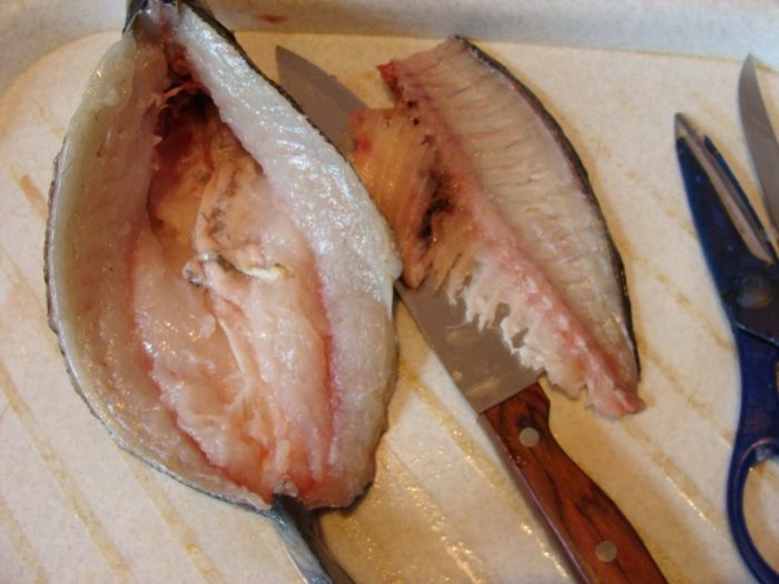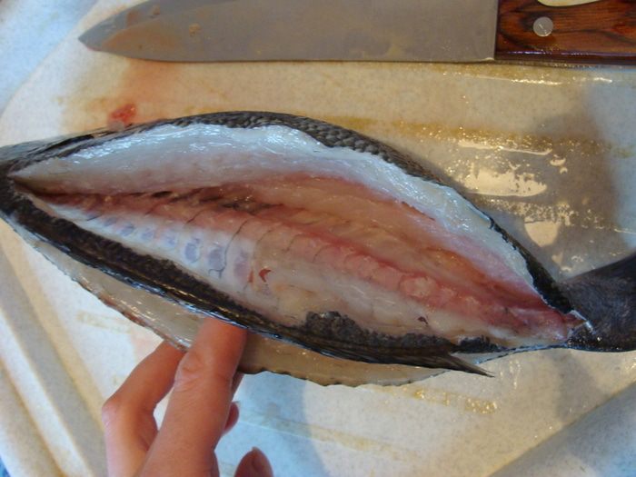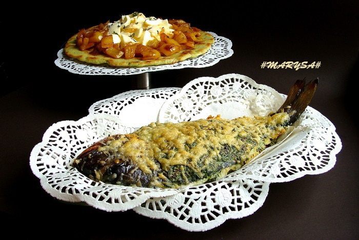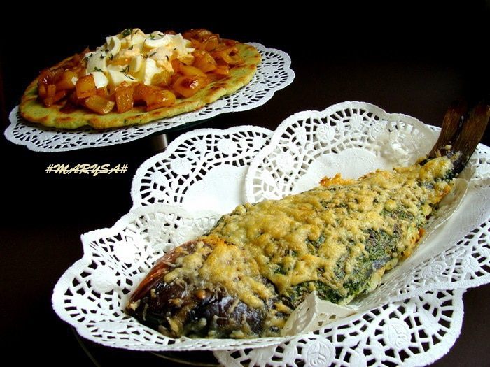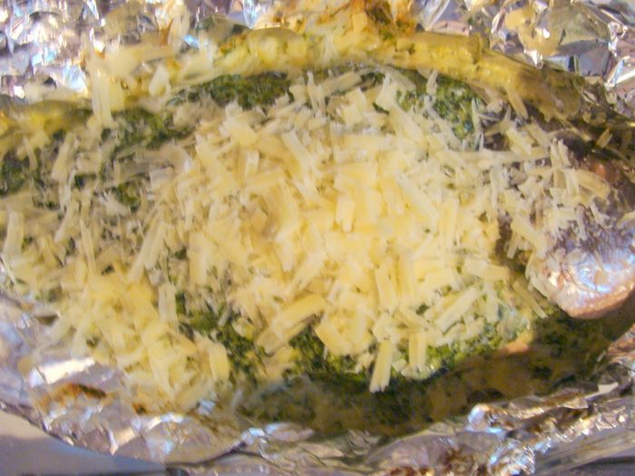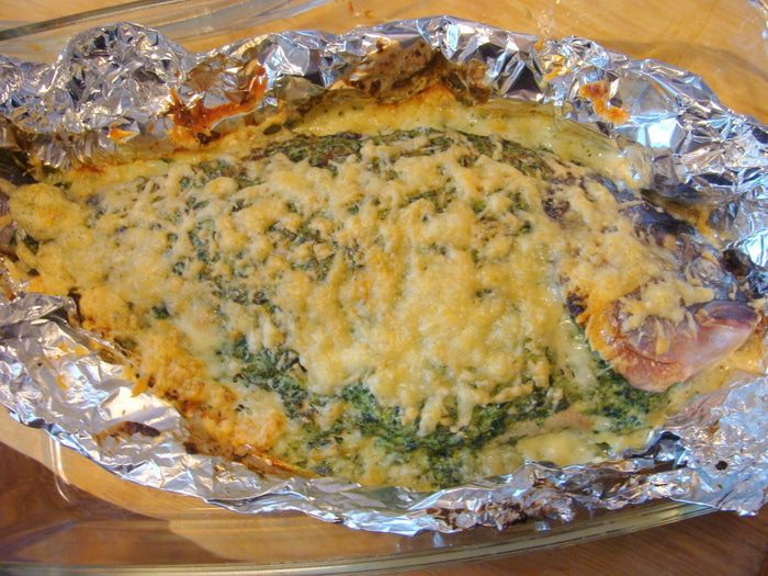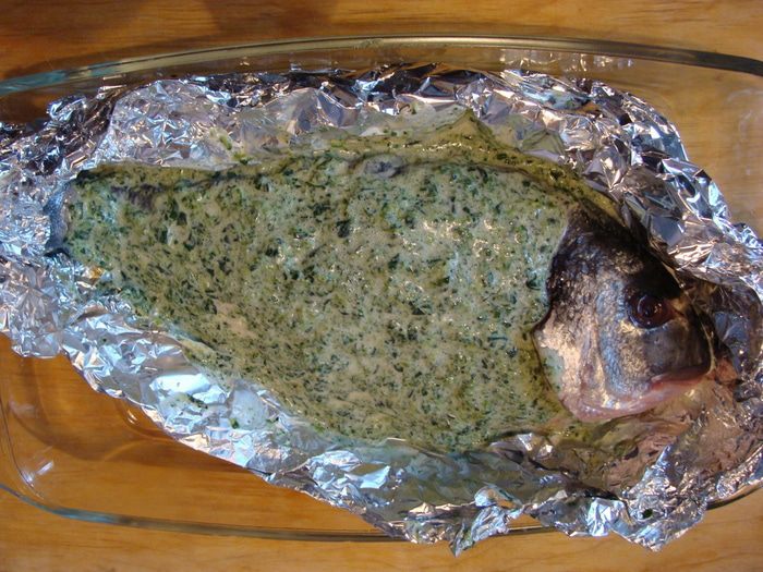 Рыбу выложить на двойной слой фольги в форму для запекания, начинить начинкой и обмазать сверху. Края фольги я подняла к верху, чтобы начинка не растекалась. Накрыть сверху фольгой, но так, чтобы она не примыкала к рыбе и ее потом можно было легко снять. Поставить в разогретую до 200-220* духовку на 25-35 минут (это зависит от размера рыбы.