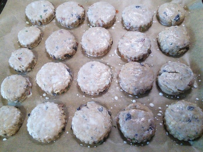 Раскатайте тесто в пласт 2-3 см высотой и стаканом выдавите кружочки - булочки. Выложите сконы на противень, смажьте оставшимся молоком и выпекайте в заранее разогретой духовке при температуре 210° в течении приблизительно 20 минут до золотистого цвета (мне понадобилось 15 минут, так, что проверяйте на сухую палочку).