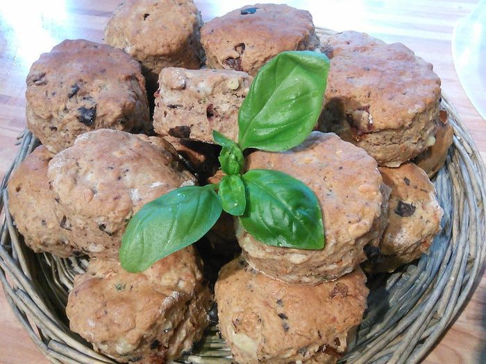 Сконы (булочки) — род традиционной английской выпечки к чаю, вроде маленьких булочек, выпекаемых без дрожжей. Они пекутся с различными добавками, а едят их обычно теплыми, разрезав пополам, с маслом, сливками и джемом, запивая горячим чаем. Те же британцы придумали выпекать сконы не сладкими, моя им огромная благодарность)). Сегодня начинкой послужили оливки (маслины), вяленые томаты и сыр. Белое сухое отлично подойдёт! Пусть всегда будет вкусно!