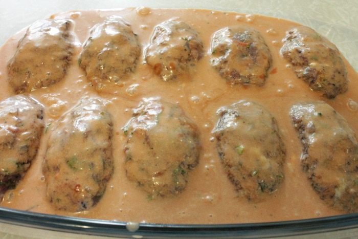 Из фарша сформовать продолговатые котлеты, выкладываем их в форму для запекания, добавляем заливку. Форму накрыть крышкой.