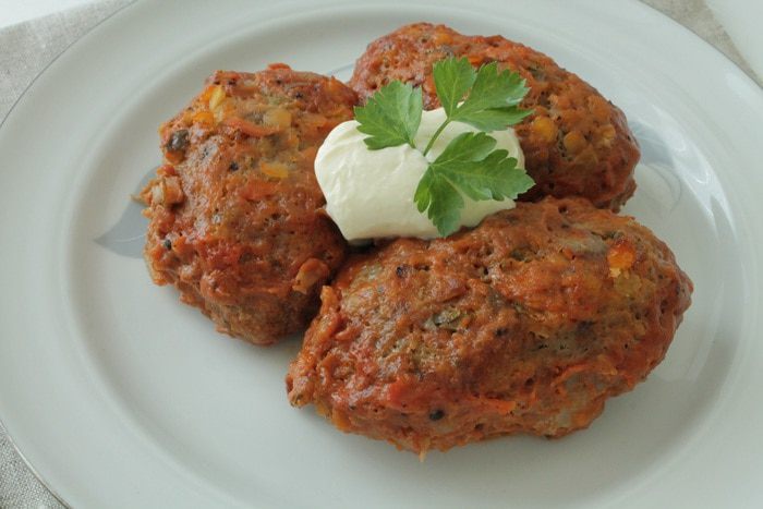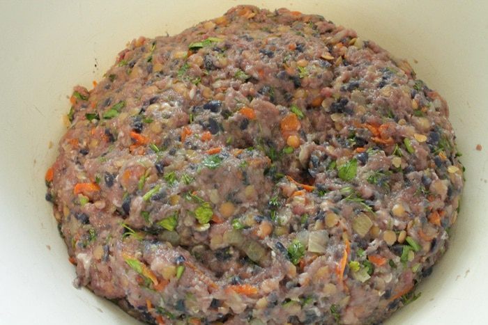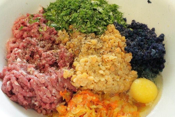 Мясо и капусту пропустить через мясорубку, добавить отваренную чечевицу, обжаренные лук и морковь, одно яйцо, зелень петрушки и укропа, посолить и поперчить по вкусу.