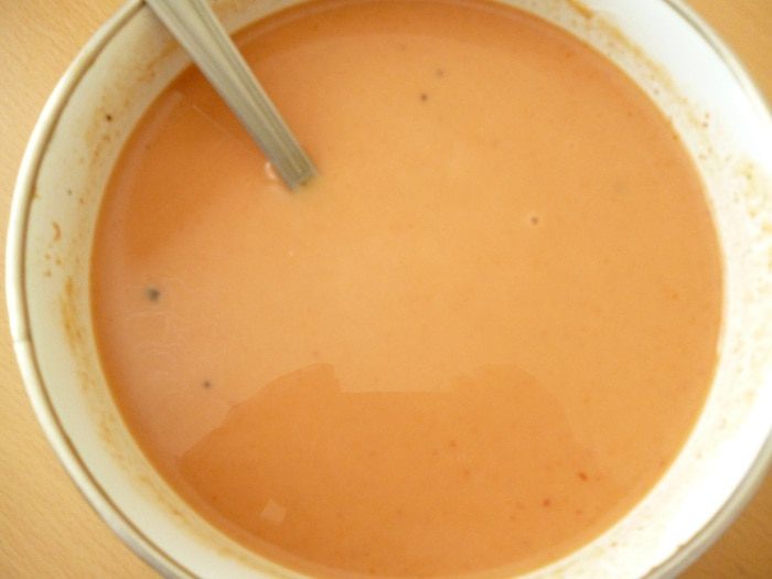 Приготовить заливку: смешать сметану с томатной пастой, добавить воду, соль, молотый перец, сахар по своему вкусу, перемешать.