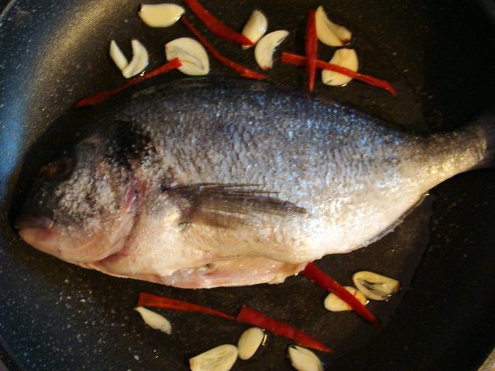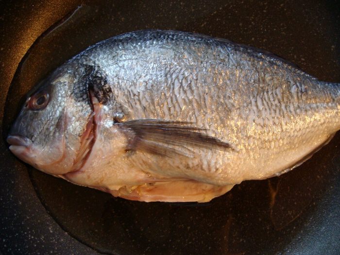 Дораду почистить, промыть и обсушить. В сковороду налить оливковое масло и положить рыбу.