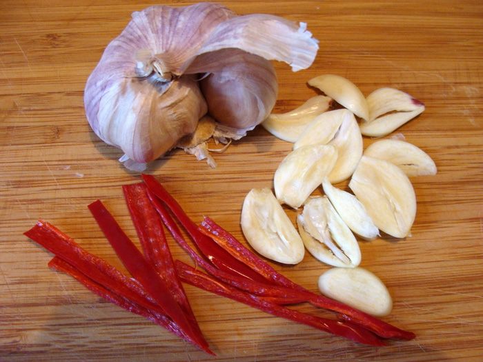 Чеснок очистить и порезать дольками. Дженнаро брал два маленьких чили, у меня был один и я взяла половинку, боясь что будет слишком остро. Еще, он режет чили мелко, я порезала крупно, чтобы потом можно было его выловить, если что :)