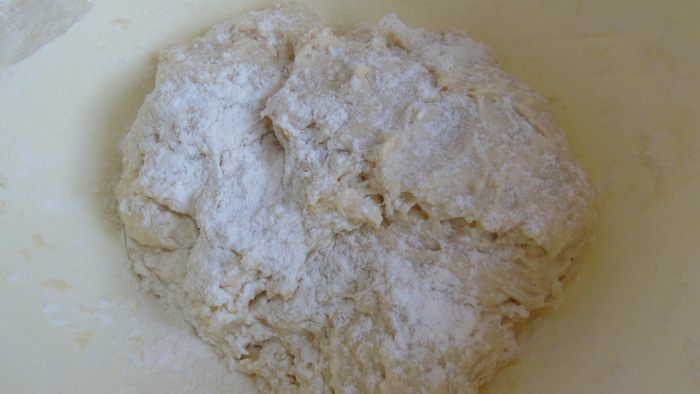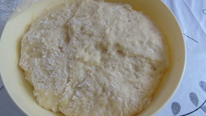 Вылить раствор в муку и замесить тесто. Вымешивать хорошо, не обращая внимания, что тесто немного жидковатое. Присыпать мукой и оставить на 1 час подходить.