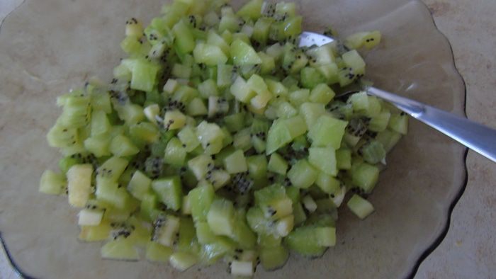 Киви очистить и нарезать кубиками. Добавить сахар и перемешать.