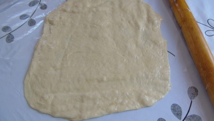 Поверхность где будем работать с тестом обильно смазываем растительным маслом. Качалку тоже смазать маслом и раскатать тесто.
