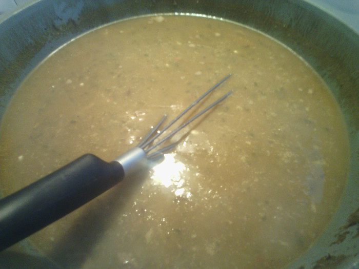 Когда закипит, добавить чечевицу и нут. Готовить 40 минут, по истечении времени, в отдельной ёмкости, смешиваем муку с 0,5 л горячей воды, чтобы не было комков. Потихоньку влить в суп все время помешивая, готовим 35 минут на медленном огне, по истечении времени добавляем вермишель и готовим до готовности вермишель.