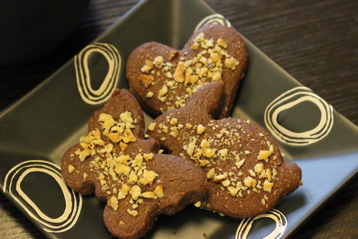 Далее сделать сухую смесь. Перемешать с мукой мелко измельчённый фундук, какао, соль, ванилин, соду. Эту смесь высыпать на стол и в неё вывалить смесь масла с сахаром и яйцами. Вымесить руками эластичное тесто. Тесто не должно прилипать к рукам, но в то же время не должно быть тугим. Если тесто прилипает, добавить немного муки. Готовое тесто накрыть плёнкой и дать постоять 30 мин. в холодильнике.
