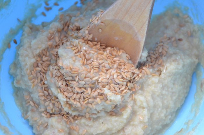 Перемалываем в блендере. Солим, перчим, добавляем, семена льна, оливковое масло.