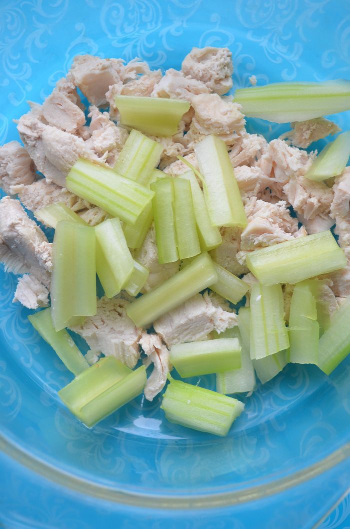 Куриную грудку отварить до готовности и нарезать небольшими кусочками. Стебли сельдерея ошпарить, очистить от внешней пленки и тонко нарезать поперек, сбрызнуть лимонным соком и перемешать.