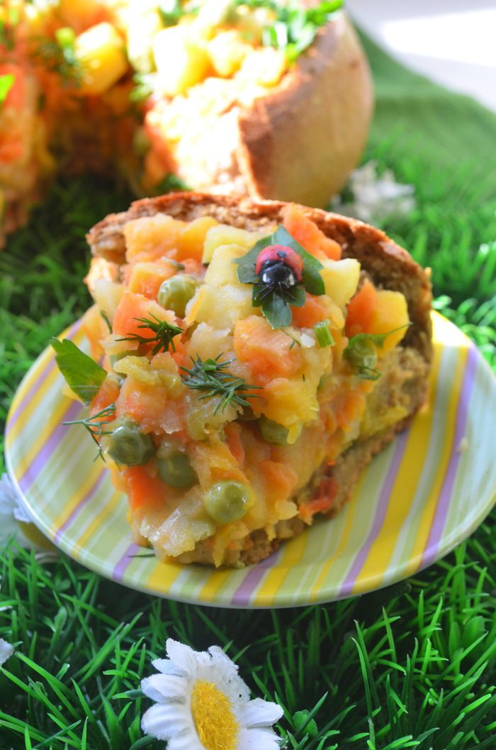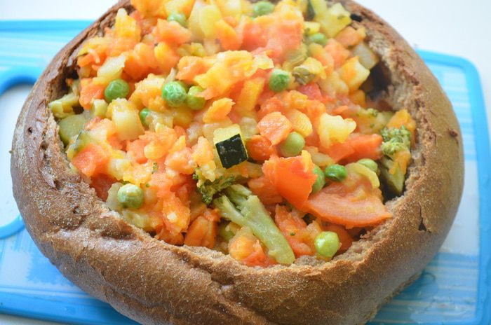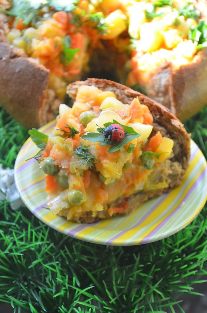 Переложите рагу в хлеб, предварительно подсушенный в разогретой духовке, сверху положите лавровый лист.