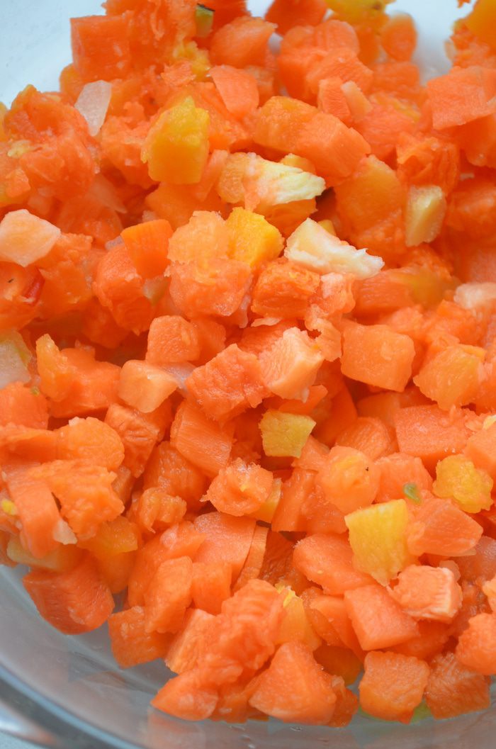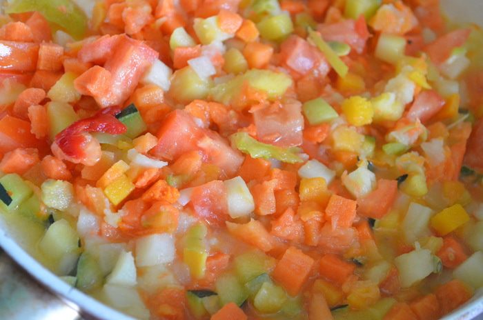 Картофель и морковь обжарьте на оливковом масле до золотистой корочки. Добавьте тыкву, томат, цукини и перец. Обжаривайте еще несколько минут и добавьте брокколи и горошек. Все хорошо перемешайте, добавьте соль, перец.