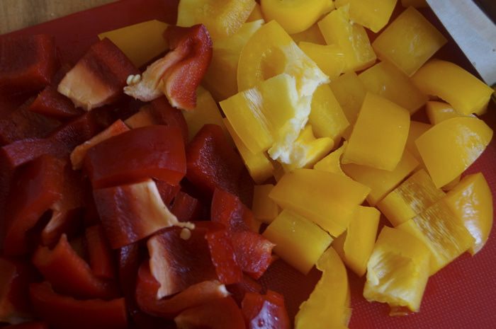 Пока суп доваривается нарезаем болгарский перец крупными кусочками. У меня перец 2 цветов: желтый и красный.