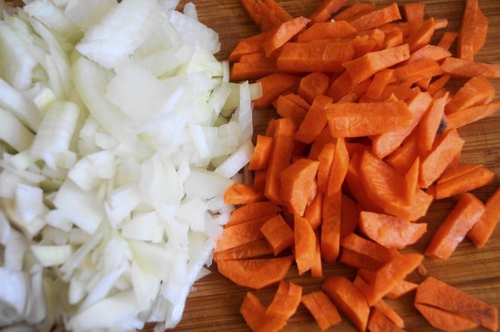 Пока готовится бульон приготовим зажарку. Для этого мелко нарезаем репчатый лук, морковь режем тонкой соломкой.