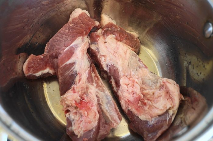 Сначала сварим бульон, для этого свиные ребра хорошо промоем в прохладной воде. Выложим в кастрюлю, зальем водой и добавим целую луковицу очищенную от шелухи. Варим бульон около 40 минут.