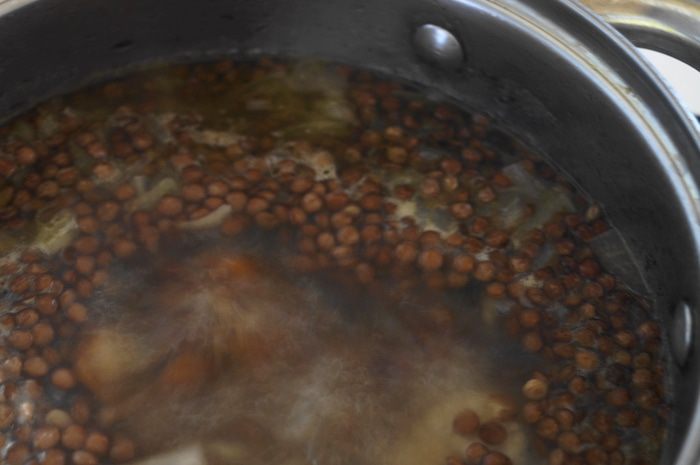 Когда бульон будет готов, выкладываем в него зажарку из овощей и чечевицы. Варим еще 20 минут до готовности чечевицы. В конце варки солим и перчим.