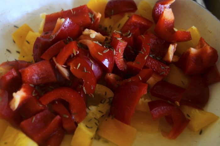 Разогреваем в сковороде немного оливкового масла и выкладываем перец обжариваем 2 минуты, добавляем кориандр и зиру, солим и жарим еще 3 минуты. Снимаем с огня.