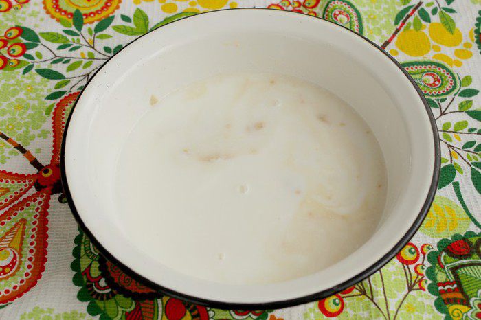 В теплую смесь кефира и воды добавить немного сахара и дрожжи, дать постоять пару минут.