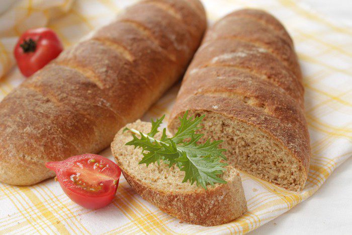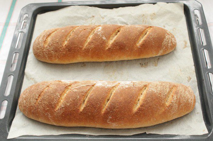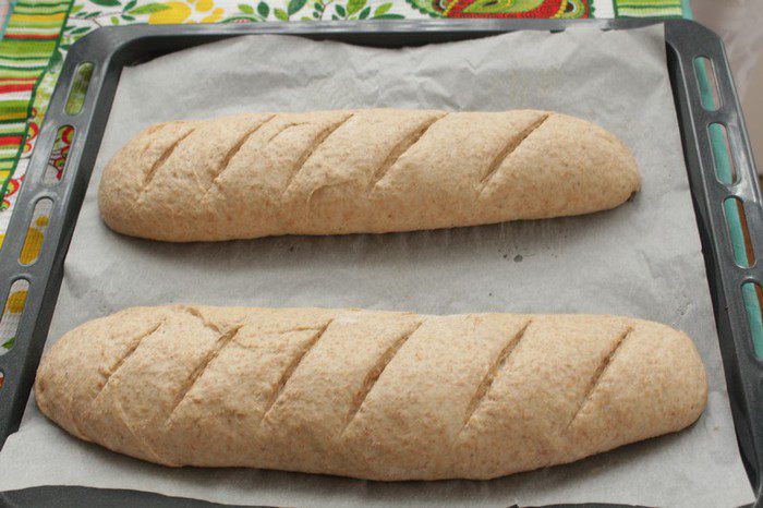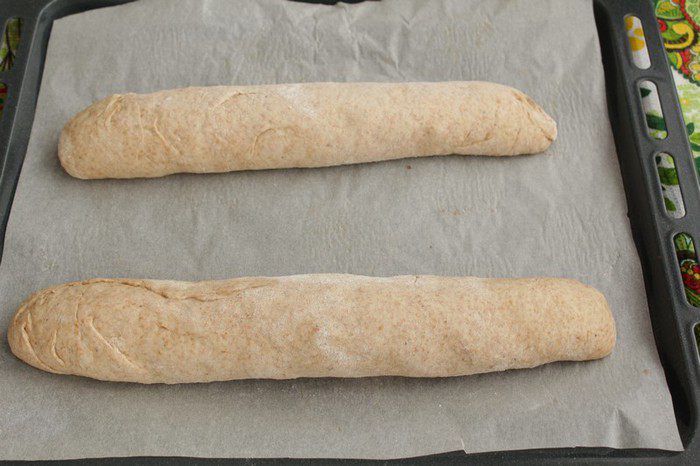 Обминаем и разделим тесто на 2 части. Формируем батоны. Выкладываем на противень, застеленный пергаментом. Накроем полотенцем и ставим в тёплое место на 30 минут.