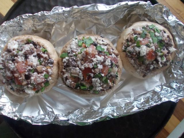 Нафаршировать плотно грибочки, выложить на фольгу и на противень, бортики и отправить в разогретую духовку 180С на полчасика.