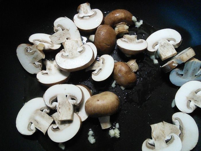 Чеснок очистить и мелко порубить. Грибы нарезать толстыми пластинами и вместе с чесноком и маслом (соевое масло можно заменить на оливковое) пропустить на сковородке до золотистого цвета. Выложить на тарелку.