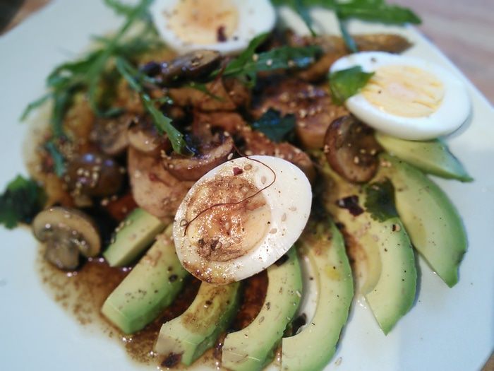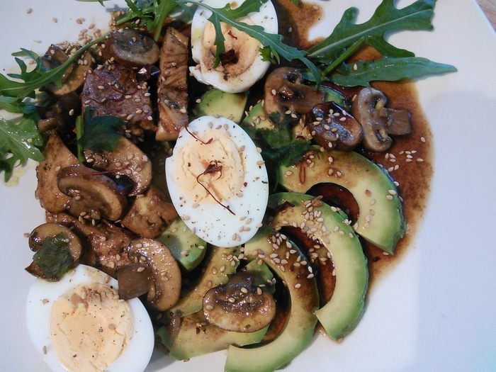 Яичный салат с куриной грудкой, авокадо и шампиньонами