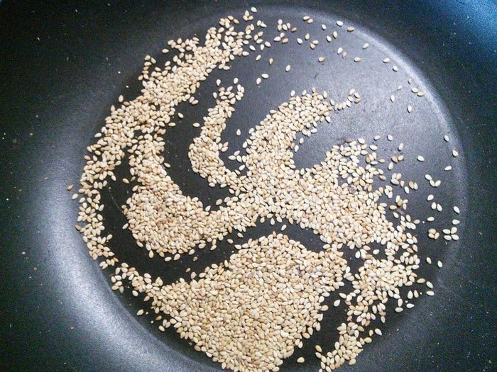 Кунжут подрумянить на сковородке, отложить в сторону. Яйца сварить в крутую, остудить в холодной воде и очистить от скорлупы.