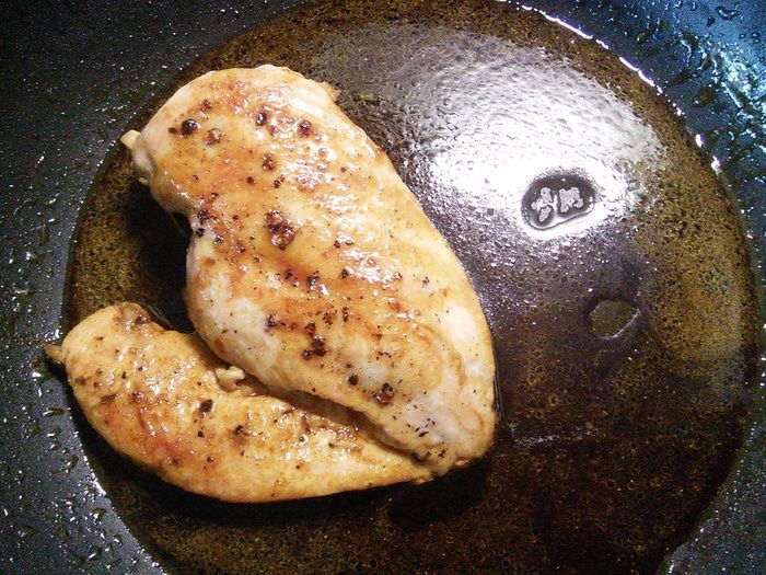Мясо посолить и поперчить, обжарить в этой же сковороде (по необходимости добавить ещё масла). Добавить мёд, карри, чили и соевый соус. Сковороду покрутить в разные стороны, чтобы соус равномерно покрыл мясо.