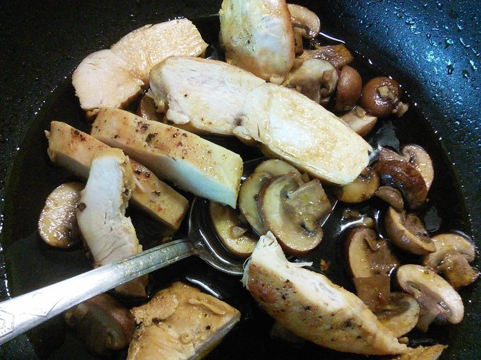 Мясо вынуть на тарелку, охладить и нарезать на кусочки. В сковородку с соусом влить бальзамический уксус, 100 мл воды (в идеале овощной бульон) и масло. Мясо соединить с грибами и дрессингом, дать настояться.