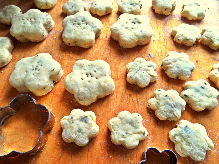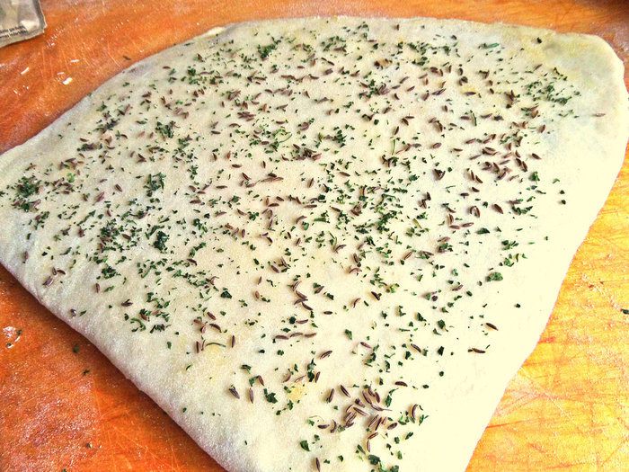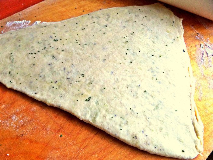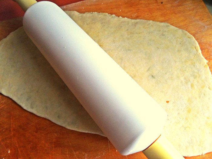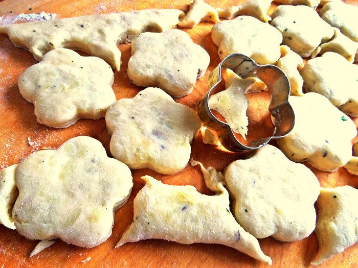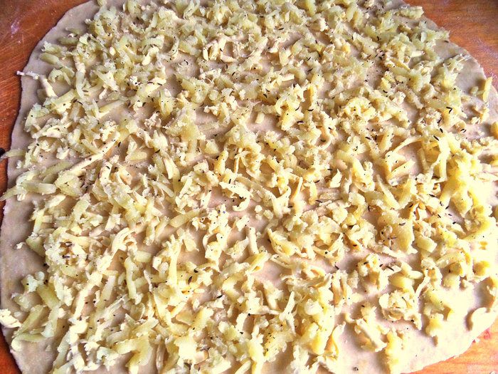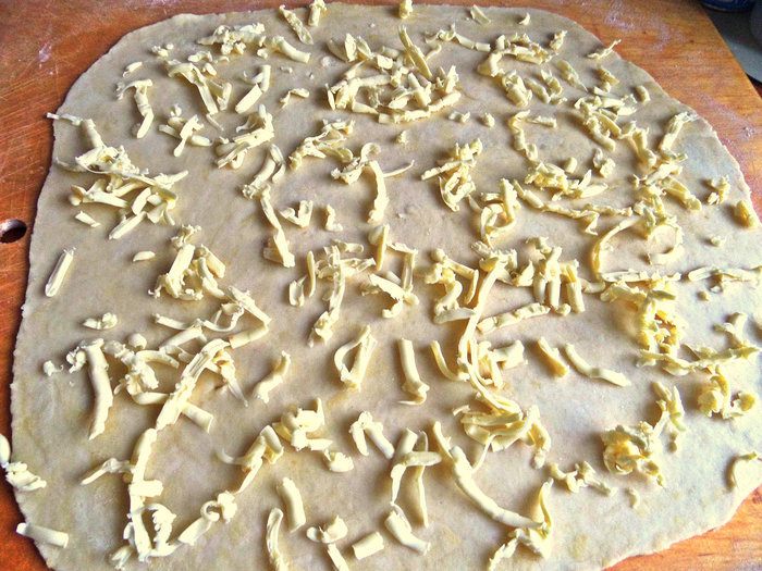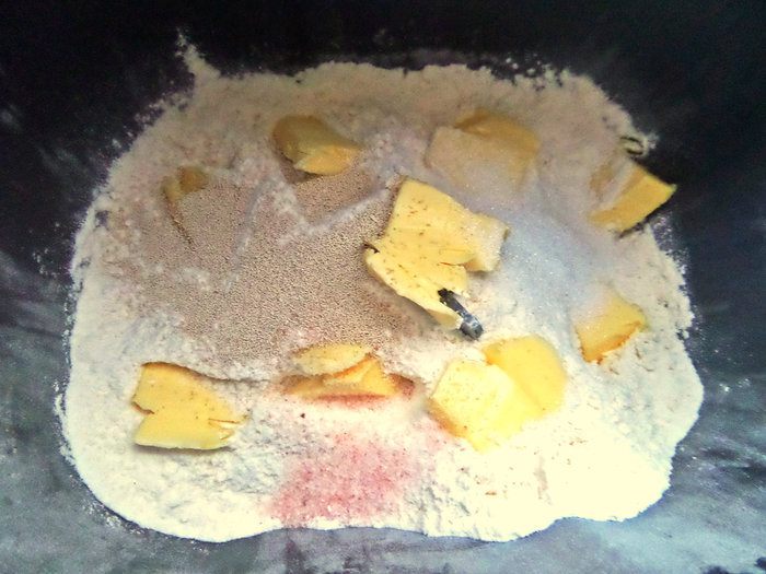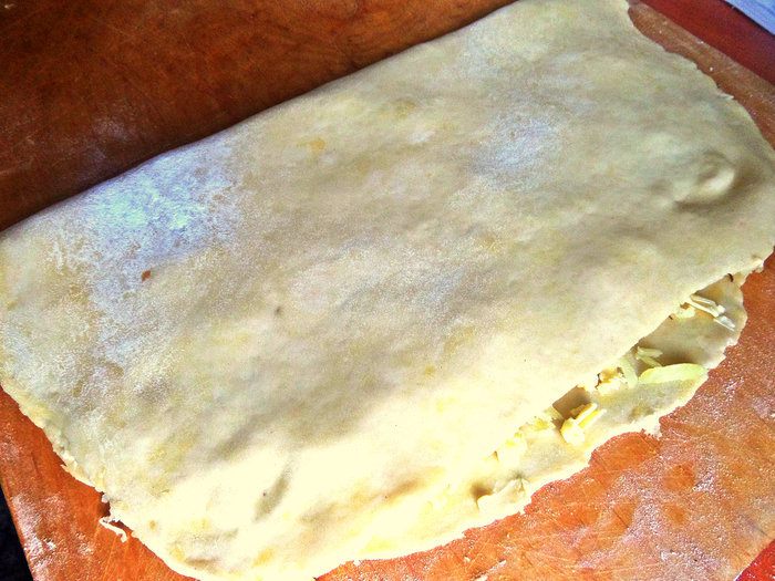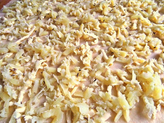 Замешиваем тесто руками или при помощи хлебопечки. Молоко берём тёплое. Масло в тесто нужно мягкое или даже растопленное,а сверху на пласт-замороженное. Поэтому,когда тесто подходит,отмерьте нужный кусочек и положите в морозилку. Картофель отвариваем заранее или ставим вариться прямо сейчас.