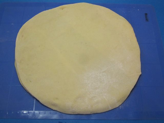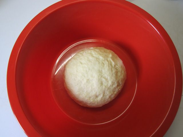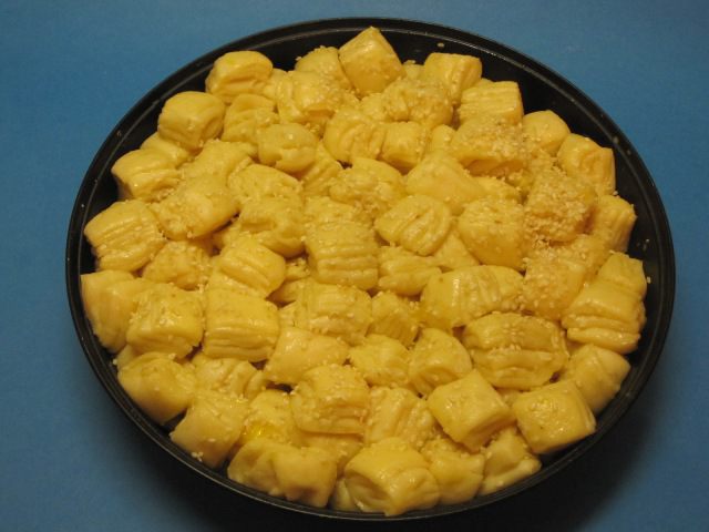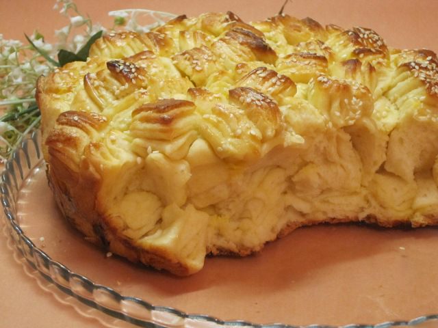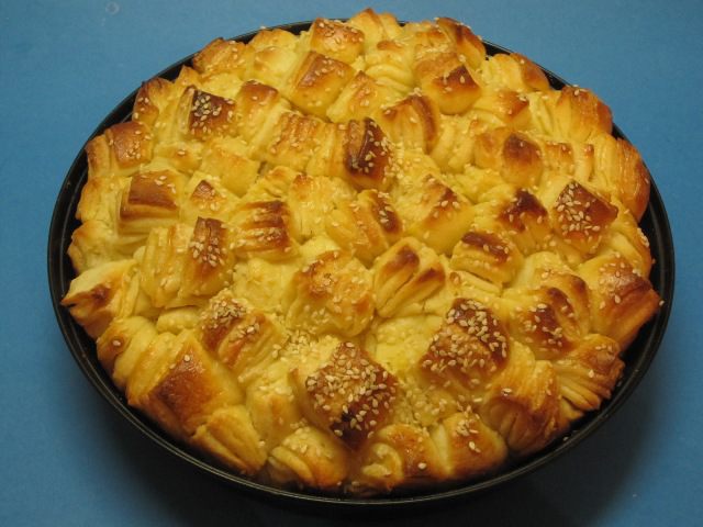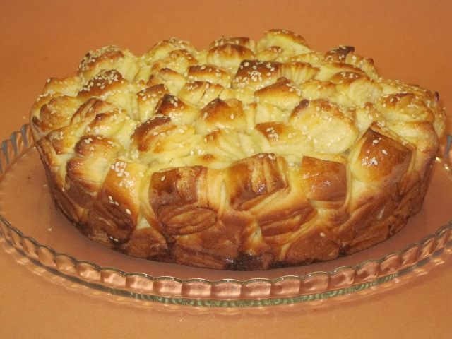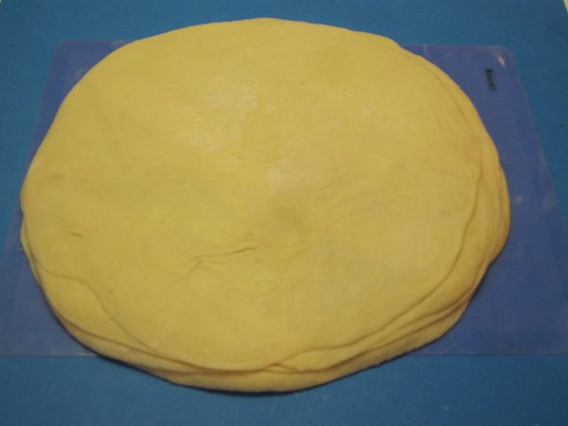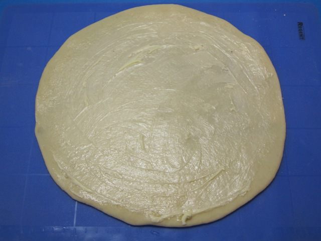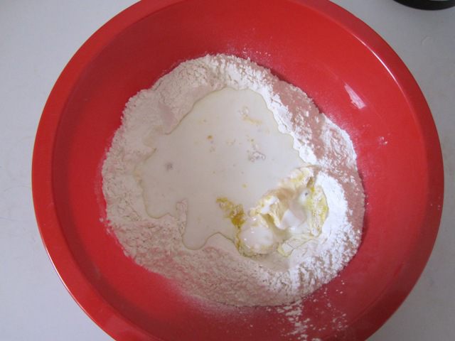 В просеянную муку всыпать соль, сахар, сухие дрожжи. Вбить яйцо, добавить 50 грамм размягченного сливочного масла (оставшиеся 80 грамм сливочного масла будет использовано для промазывания слоев теста). Влить йогурт и 150 мл теплого молока (10 мл останется для смазывания пирога).