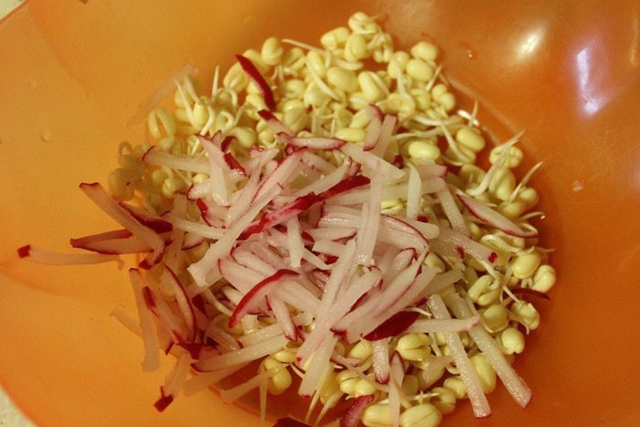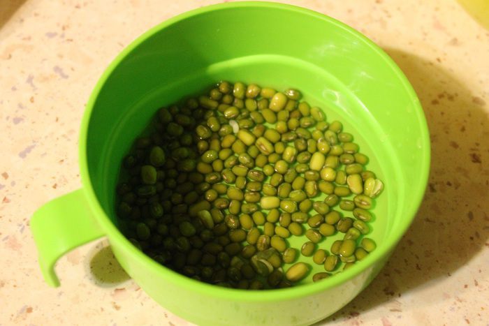 Фасоль маш промыть холодной водой. Сложить в миску ровным слоем, залить теплой водой, чтобы вода слегка покрывала фасоль. Накрыть фольгой или крышкой и поставить в темное место на 12 часов. Я сделала это вечером.