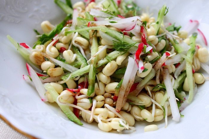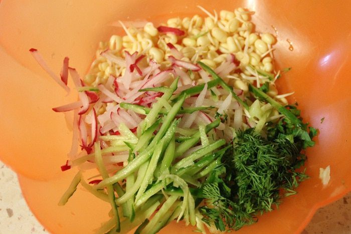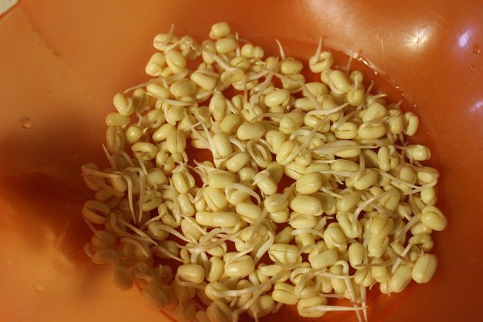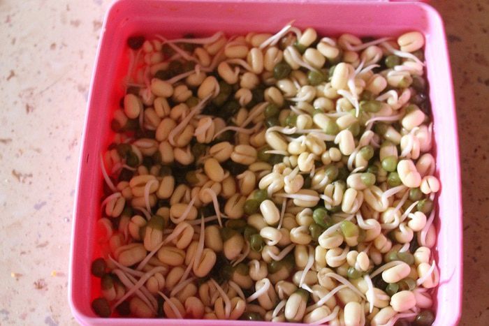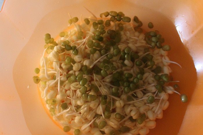 Утром фасоль разбухла и полопалась. Ее нужно переложить в сито и промыть. Затем переложить в емкость побольше и опять слегка залить теплой водой. Накрыть и убрать в темное место. Вечером повторить процедуру.